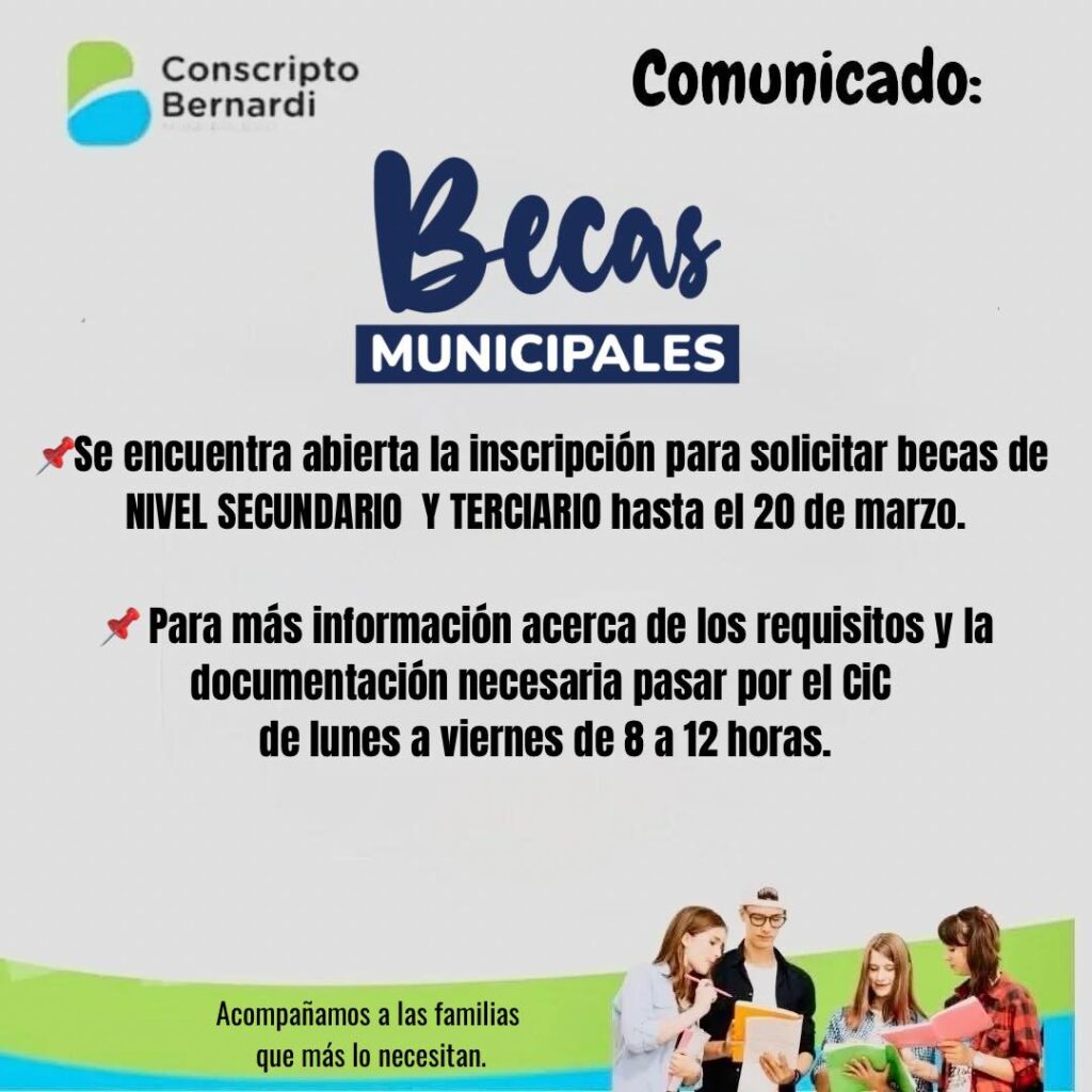 La Municipalidad de Conscripto Bernardi informa que ya se encuentra habilitado el período para solicitar las becas estudiantiles 2026. Los interesados tienen tiempo hasta el 26 de marzo para retirar y presentar los formularios en el CIC local.